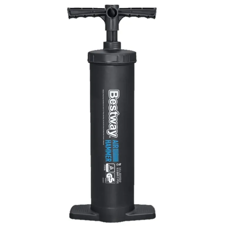- Pompe manuelle Air hammerA 37 cm* Volume/cycle = 3,5 L* Gonfle a chaque mouvement* Tuyau flexible* Grande chambre a air pour un gonflage rapide* 3 adaptateurs pour convenir a presque toutes les valves de gonflage* Concu pour un produire un debit dAai