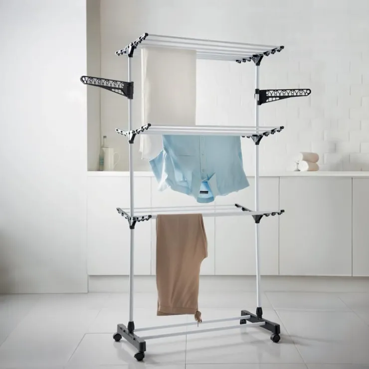 - 15 METRES D’ETENDAGE DE LINGECROCHETS PLIABLES POUR SUSPENDRE LES VETEMENTS SUR CINTRESFOURNI AVEC ROUES POUR UNE MEILLEURE MANIABILITE3 NIVEAUX D’ETENDAGE
